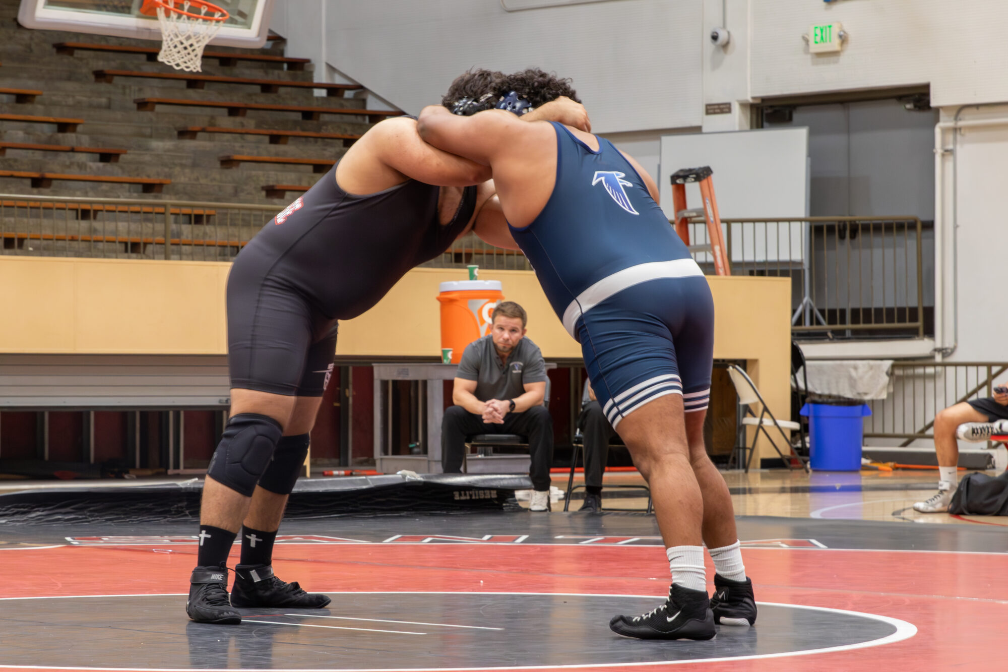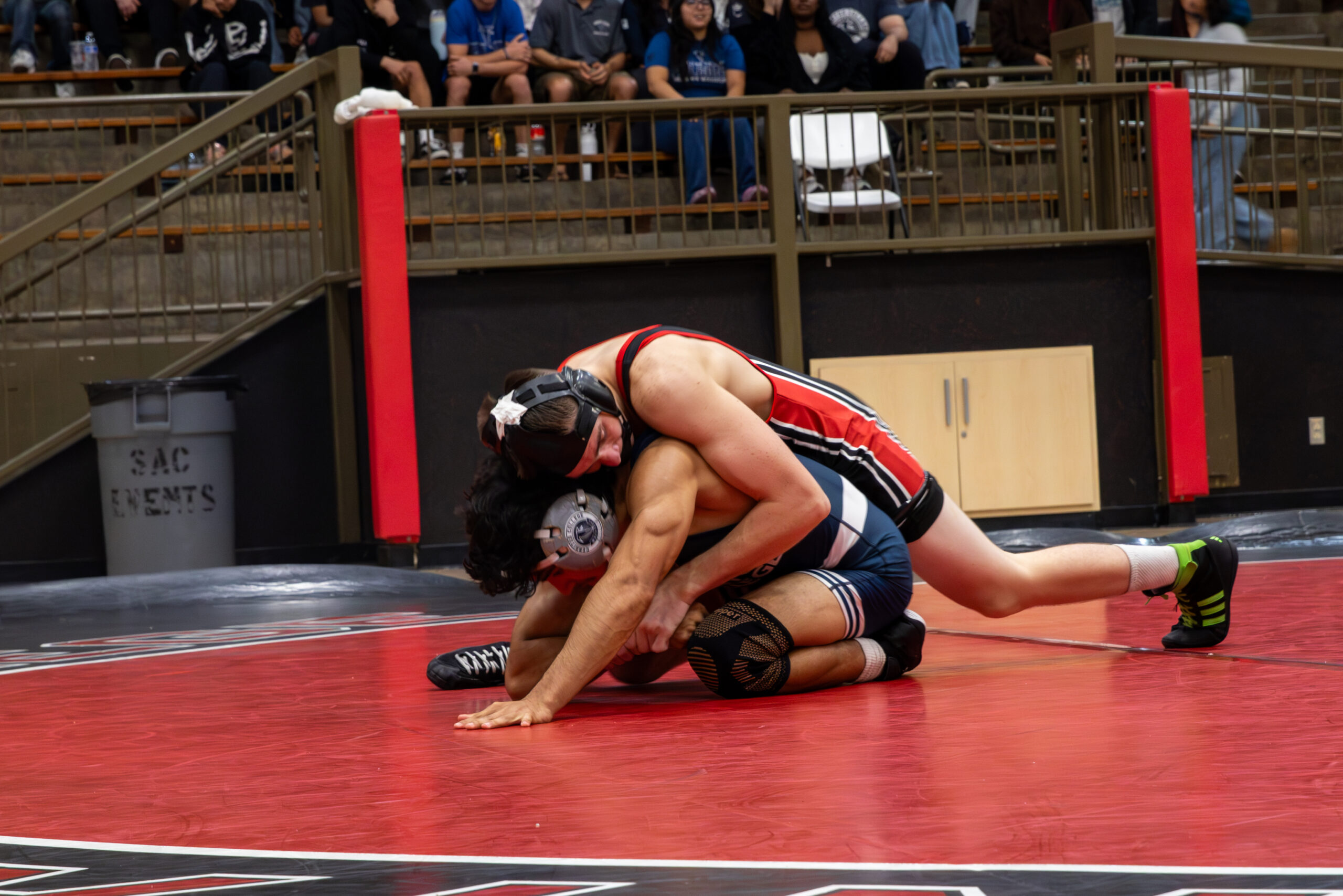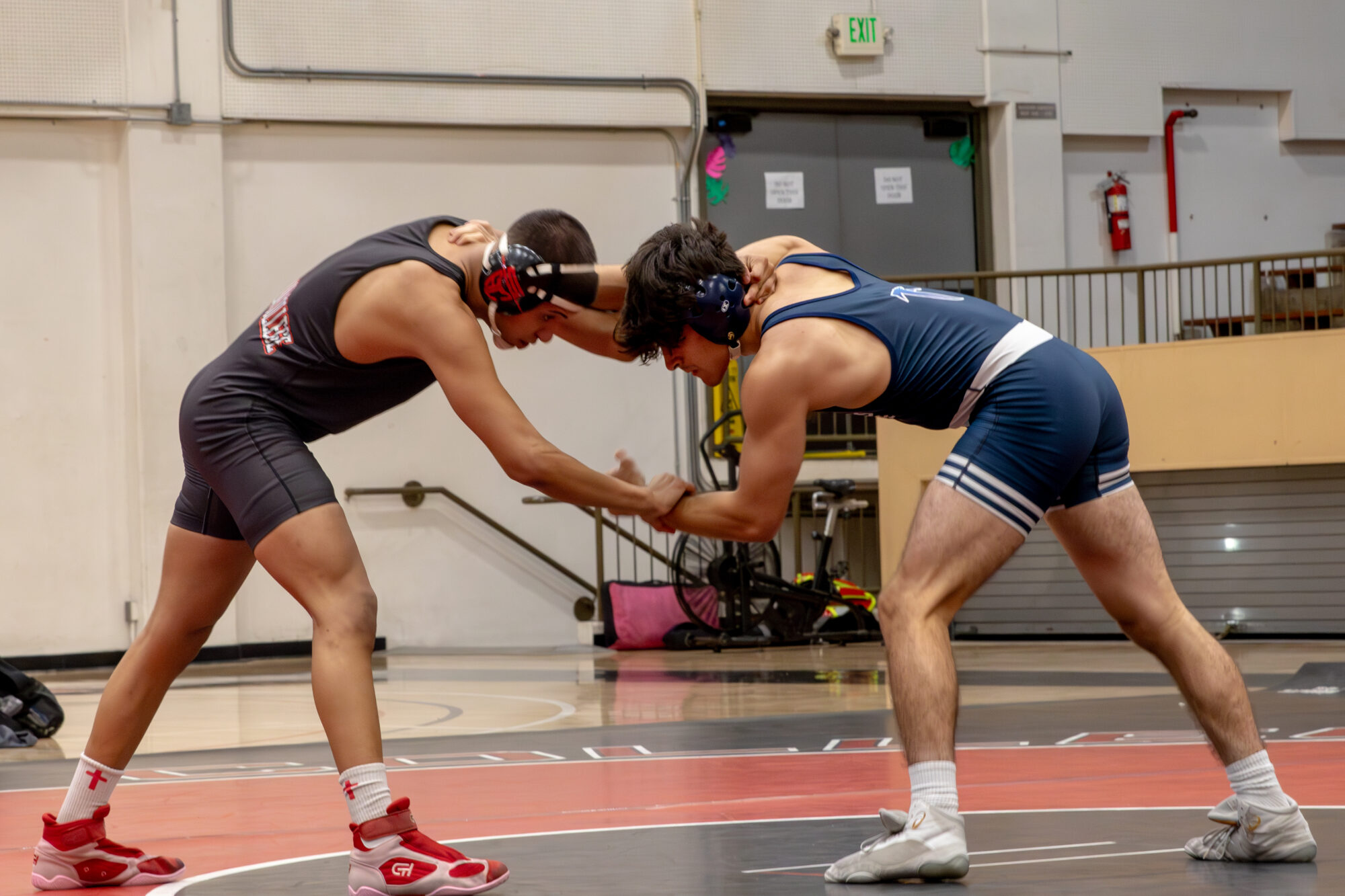 Dylan Avila, tussles with Cerritos College wrestler. Photo by Gia Santolalla / el Don