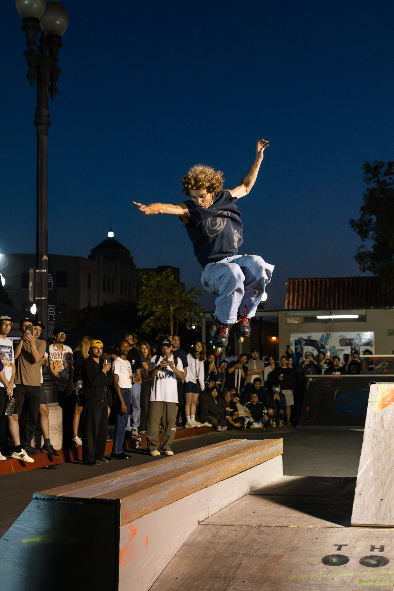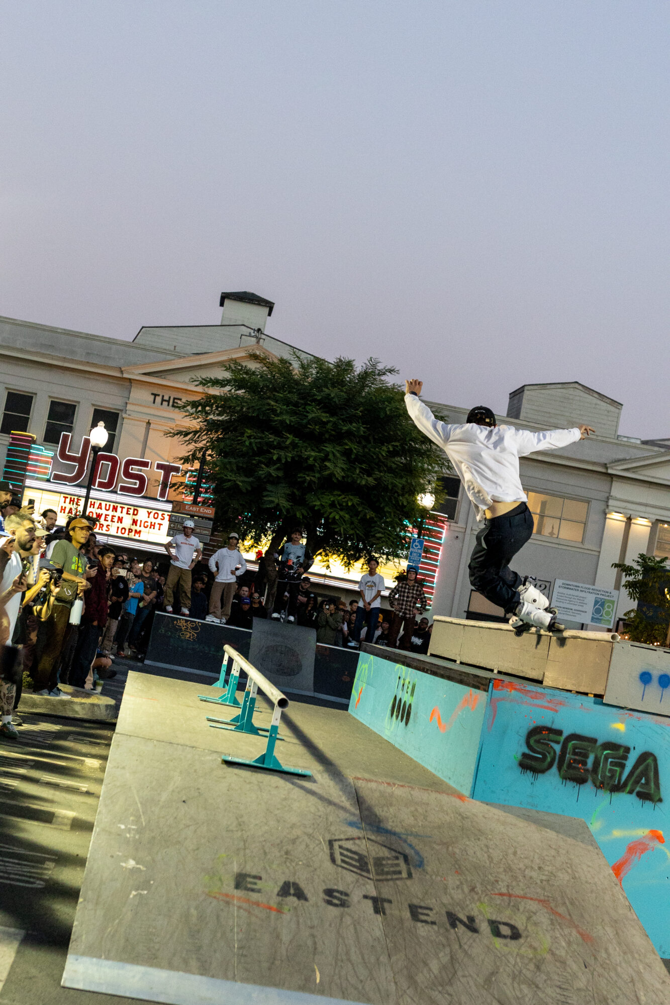 In the shadow of the Yost Theater, a man wearing rollerblades stands atop a quarter pipe with a crowd of hundreds chanting his name. He takes off from the ramp to jump onto a grind rail six feet into the air. As he balances on one foot, he leaps off, busts a 180°, and lands skating backward as he triumphantly smiles.