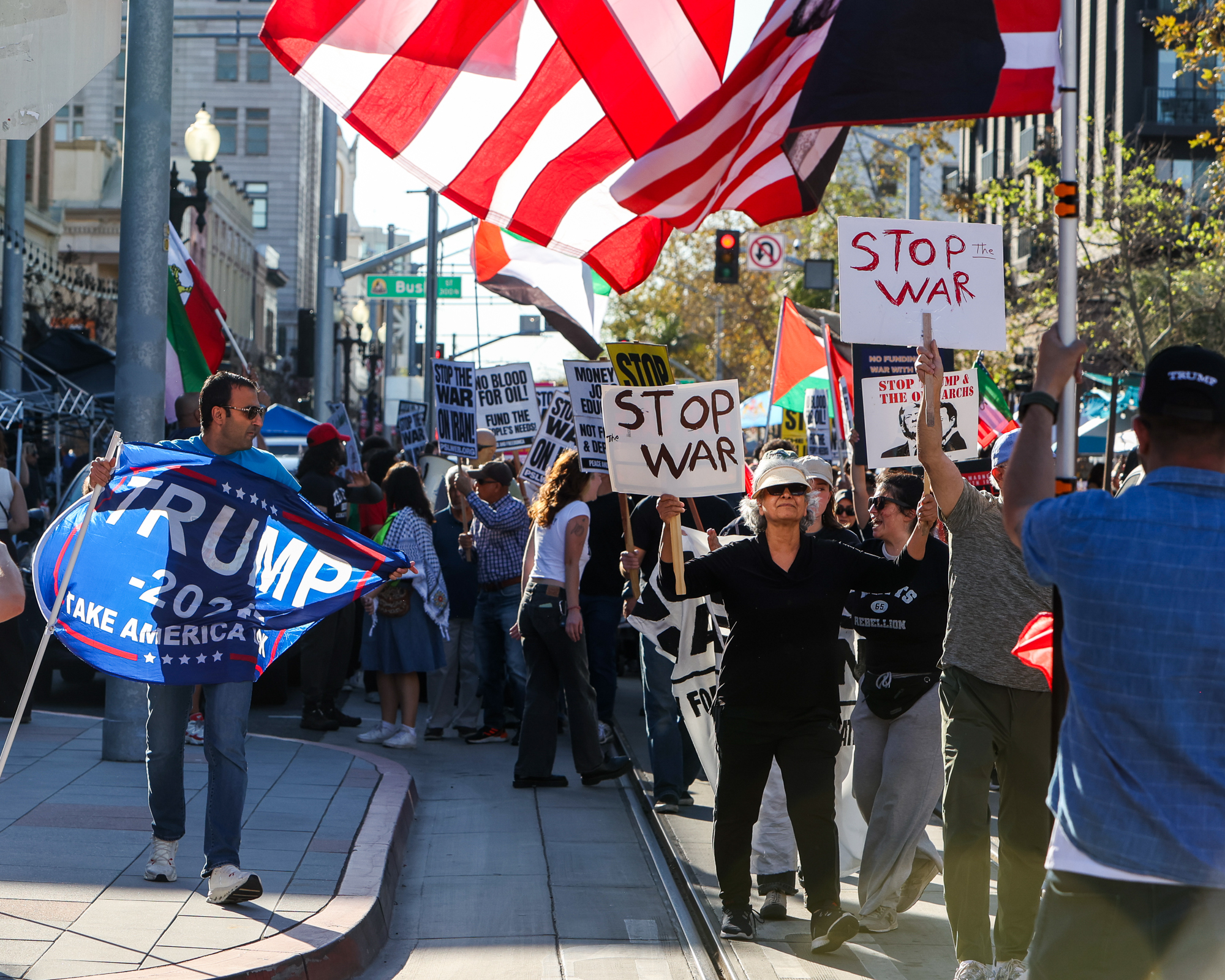 In the early evening, a group of anti-war protestors marched down Fourth Street near the end of the event, followed by a larger group of pro-Trump, pro-war counter-protestors, who were seen banging on cars and shouting into windows.